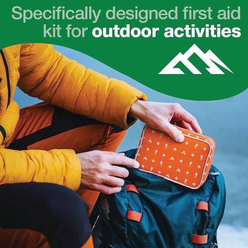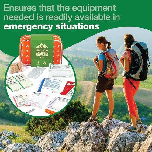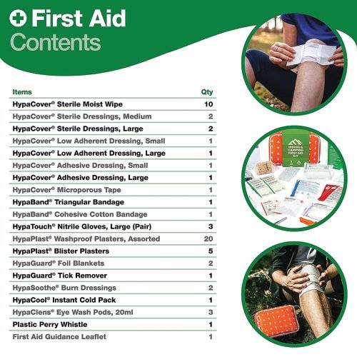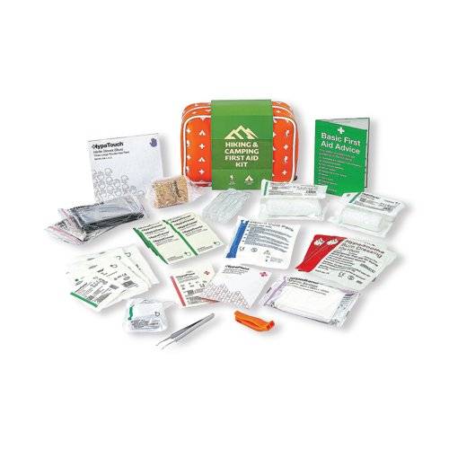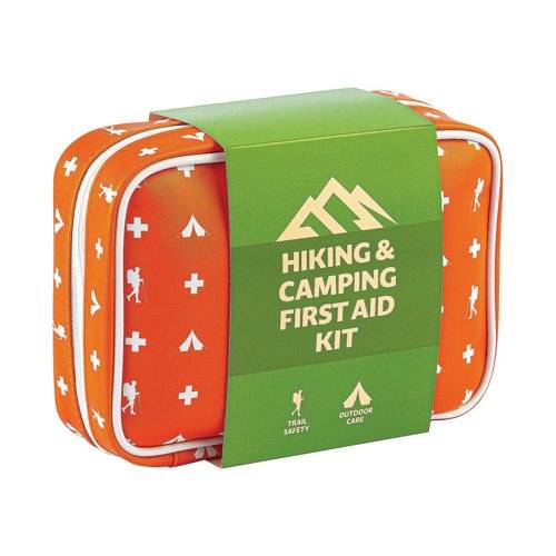 - For those who enjoy adventure and being outside, hiking and camping are great ways to spend their free time, however there are dangers to both activities depending on the situation. The Safety First Aid Group's Hiking and Camping First Aid Kit provides the essential supplies necessary for treating common injuries while exploring the great outdoors. The main difference between a general first aid kit and this kit designed for camping or hiking are the contents supplied. For example, this camping first aid kit includes sterile moist wipes, dressings and plasters as well as supplies not typically found in a general kit - such as a tick remover, an instant cold pack and a plastic whistle. This reusable zippered first aid case is designed to keep contents organised, secure, and easily accessible during any outdoor adventure. Inside, two internal mesh pockets help keep supplies in place, making it simple to find what you need fast. With its bright orange background and white decals of a first aid cross and a hiking silhouette, this kit is instantly recognisable as a hiking and walking first aid kit, ideal for use on trails, nature walks, or camping trips. The case is made from a durable, water-resistant material that’s easy to wipe clean, making it perfect for outdoor conditions and unpredictable weather. A removable cardboard sleeve provides clear, at-a-glance visibility of the kit’s contents, so users know exactly what’s inside before they need it - crucial in any emergency situation.