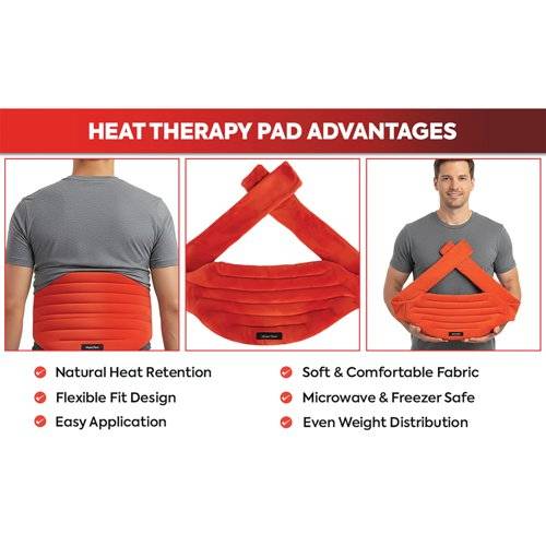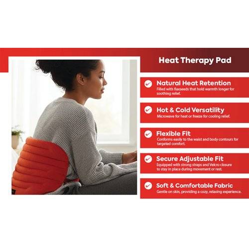 - Deflecto Reusable Microwave Flaxseed Heating Pack for Lower Back provides pain relief for sore muscles and stiff joints, alleviated by moist heat therapy which stimulates blood circulation and increases flexibility. An easy fastening belt design ensures secure heat and pain relief to target the lower back, a long lasting warmth also provides deep muscle relaxation. The fabric should be clean and dry, do not heat if wet. To heat up, lay the flaxseed pad flat in the centre of the microwave for two to three minutes. Shake before use and test the temperature by placing the product to your wrist or inner arm prior to applying to the body.