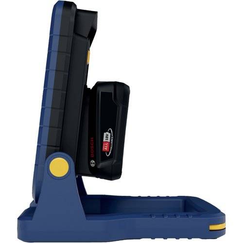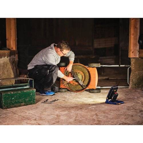 This cordless work light runs on an 18V battery, so you can work anywhere – in the garage, shed, attic, or other places without power outlets. The lamp head tilts up to 180°, making it easy to point the light exactly where you need it. The work light is easy to set up or hang using the built-in hook or handle.