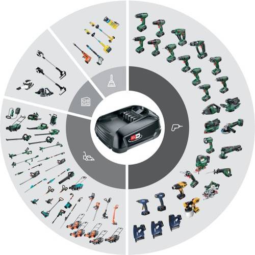 The Lithium-Ion cells inside the battery pack can be charged quickly without memory effect for a long battery life time. The battery is compatible with all Rapid 18V Power Tools as well as with numerous other products from participating brands of the POWER FOR ALL ALLIANCE like Bosch, Gardena, Gloria and Wagner. This means that you no longer need to buy one battery for every product, you to easily switch from one product to the next whenever the need arises. You save money and stay flexible at all times!