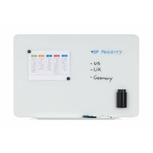 - The Bi-Office Lago Magnetic Glass Whiteboard a stunning cross between sophistication and functionality is a superb fit for offices or meeting rooms. This glass board brings a hint of elegance into work presentations without compromising execution. Efficient communication is the key to success. Explain subjects brainstorm ideas and be creative. Decide plan and analyse. All in one place. The tempered glass is a high-performance dry wipe surface: no ghosting easy cleaning and lifetime use. Enjoy a unique free-flowing writing feeling and post relevant items on the opaque magnetic surface. Its hidden wall-mounting system and smooth frameless aesthetics match any modern and stylish decor and can be enhanced with equally elegant accessories. The board is supplied with a metal tray to keep accessories always at hand as well as the installation kit.